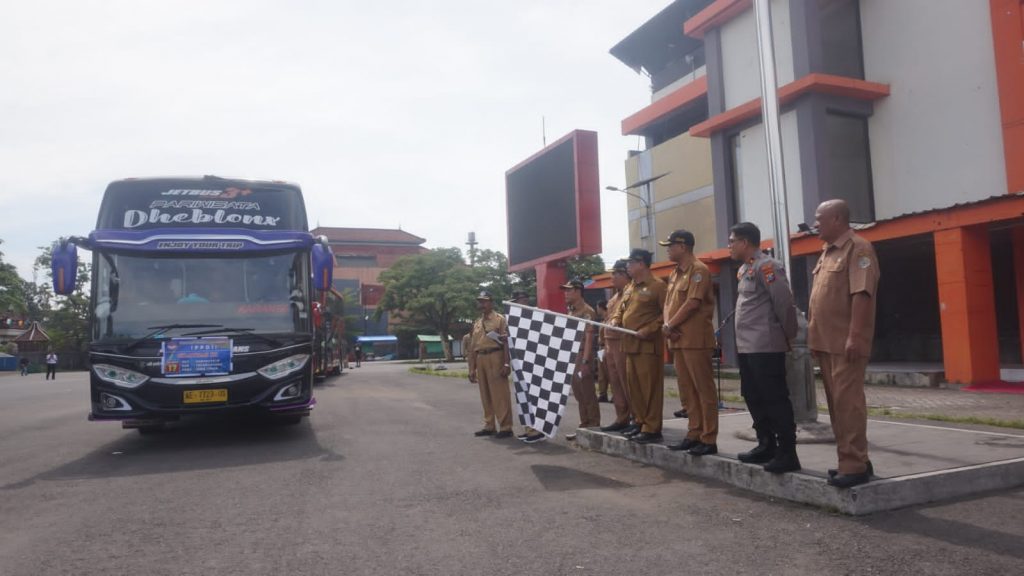 Sesuai pantauan media ini, bus satu demi satu berdatangan ke Gor Lembu Peteng mulai pukul 09.00 WIB, dengan membawa perangkat desa didalamnya.