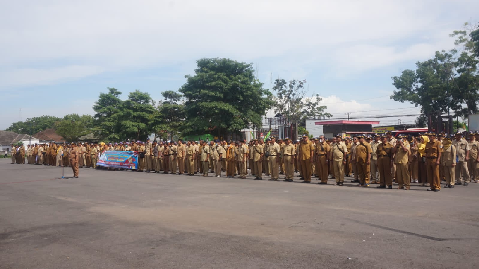 Usai ratusan perangkat desa berkumpul, kemudian semuanya berbaris rapi dengan satu komando untuk pemberangkatan.